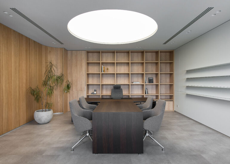 The overall color scheme is light and concise. The use of wooden panels, concealed installation doors and built-in cabinets in the offices provides additional convenience.