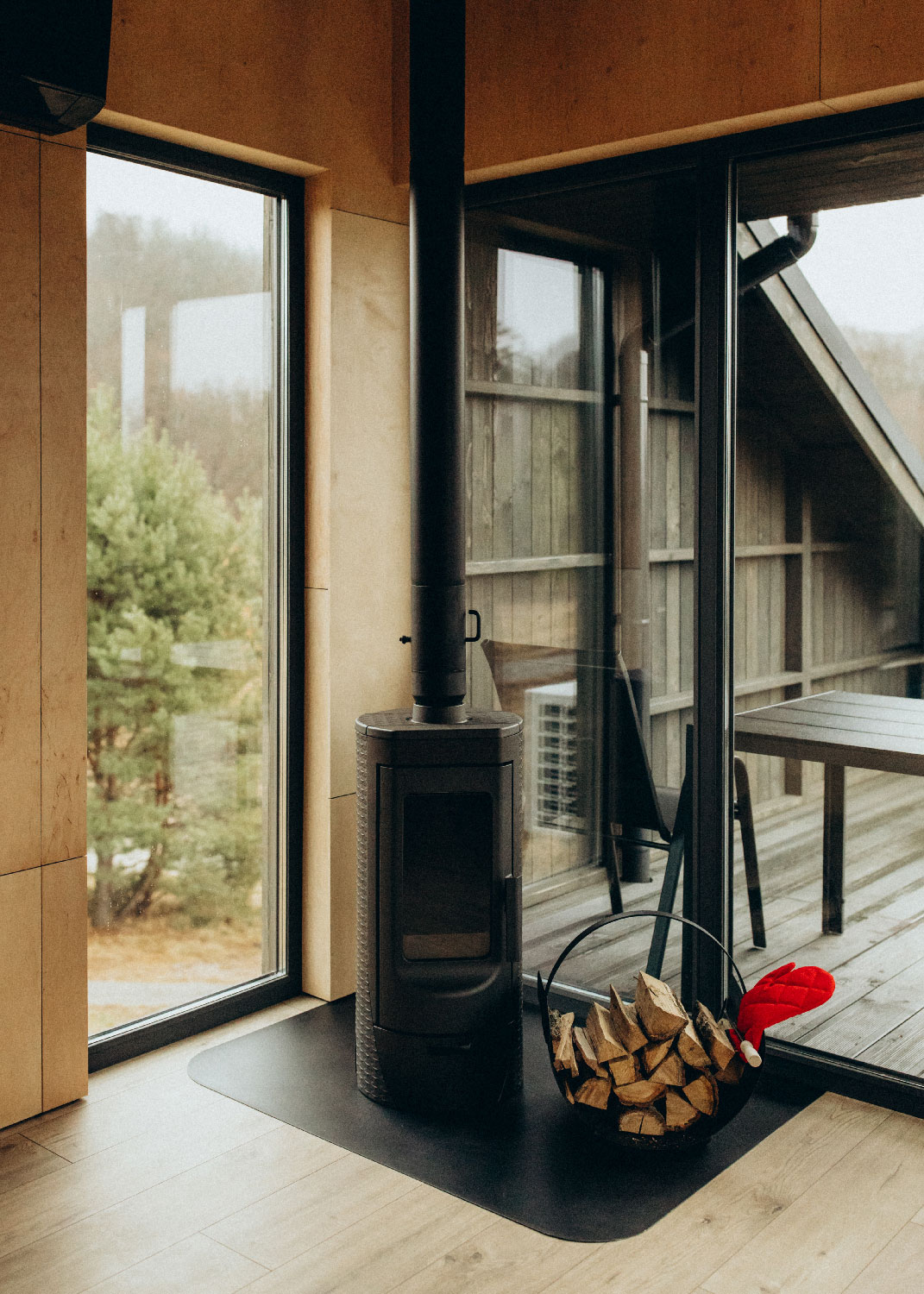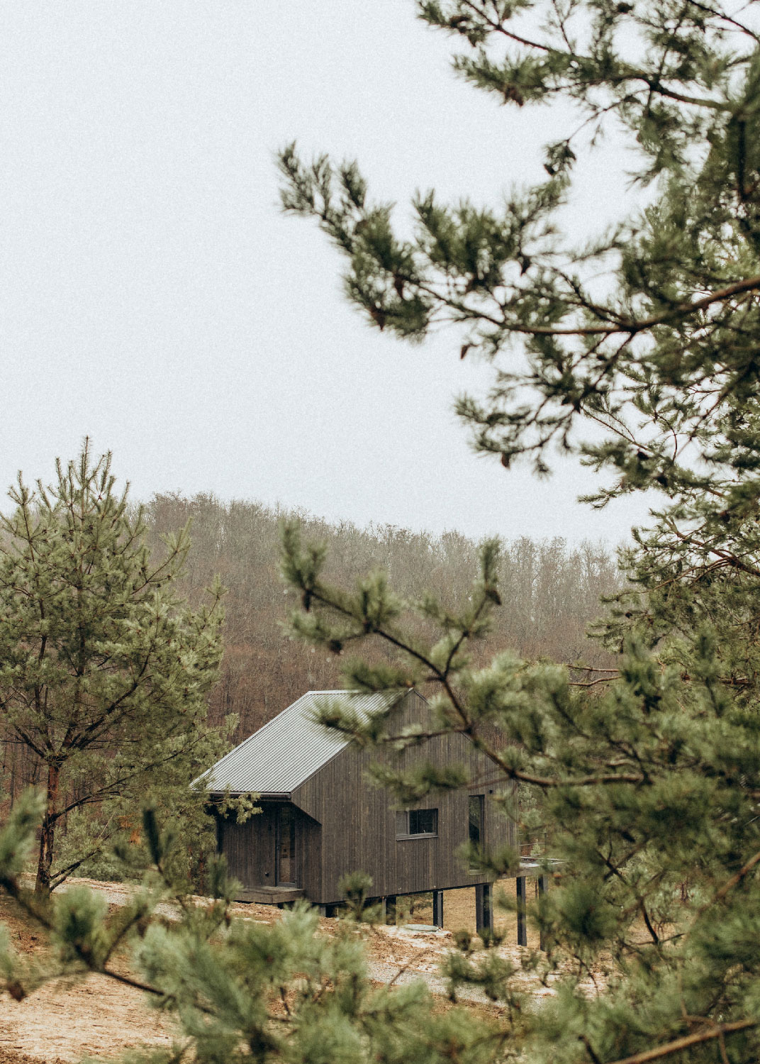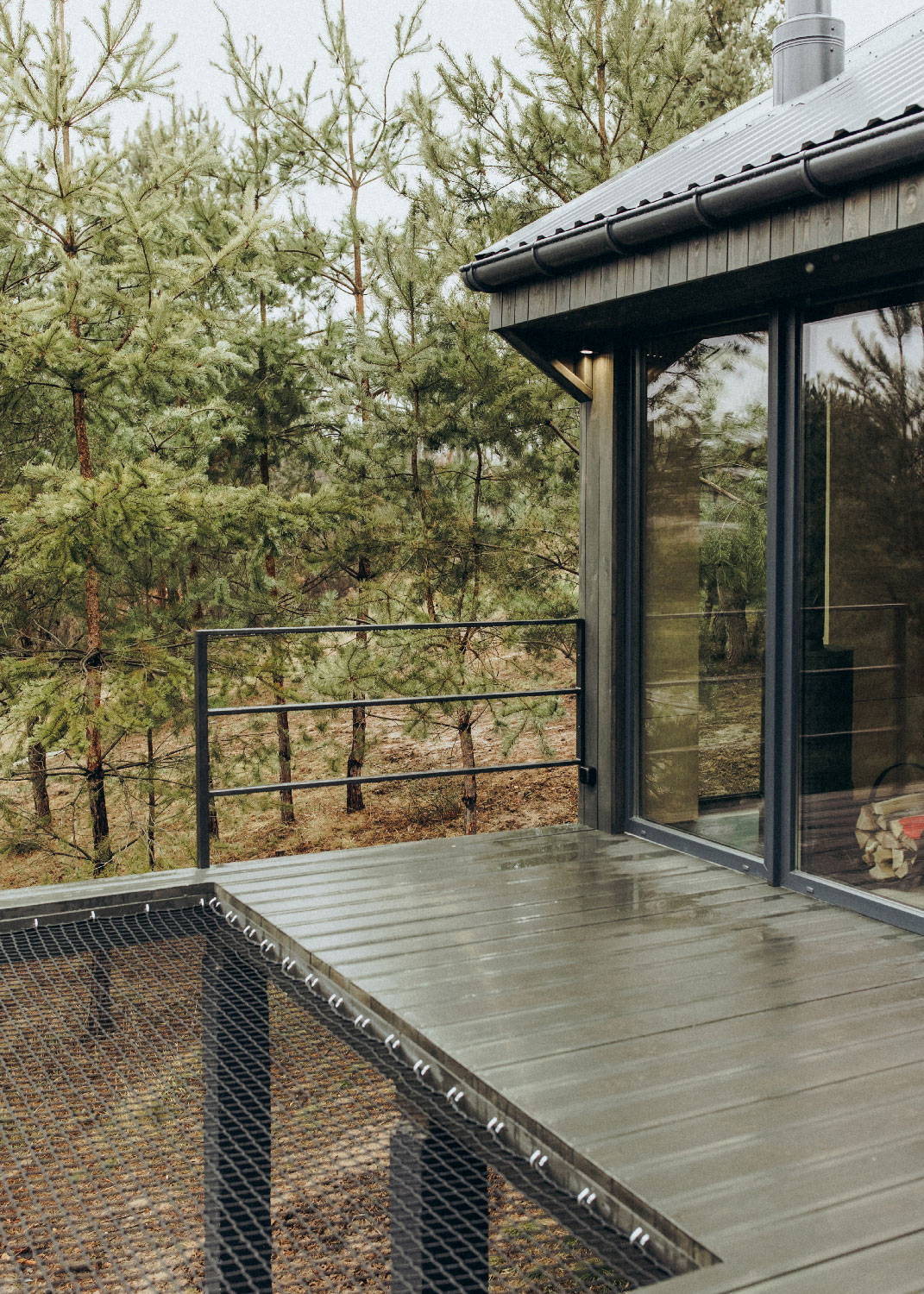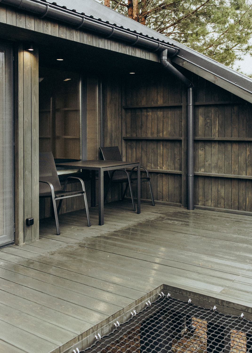 Двухэтажный домик с антресольным вторым этажом расположен на склоне с выраженным перепадом высот. Просторная терраса, частично ограждённая, обеспечивает дополнительную защиту от непогоды и визуальную приватность. Рядом с домиком предусмотрена собственная мангальная зона с мангалом-костровой чашей и стационарной решёткой.